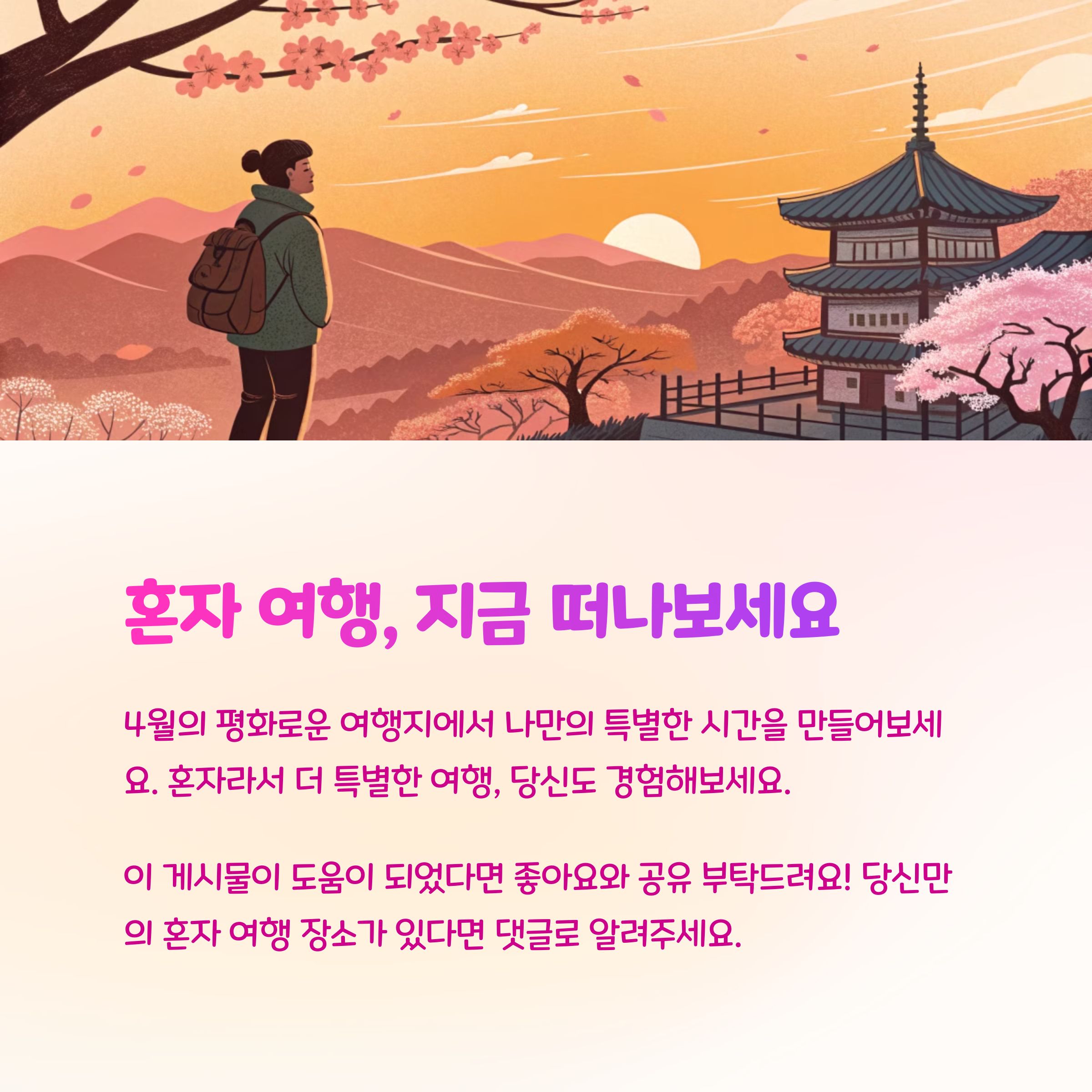 혼자 떠나는 여행, 막상 해보면 누구보다 나와 깊은 시간을 보낼 수 있는 소중한 기회예요. 특히 4월은 날씨도 완벽하고, 붐비는 피크 시즌 직전이라 한적한 장소를 누리기에 딱 좋은 타이밍이에요. 벚꽃도 피고, 바람도 살랑이고, 혼자서도 충분히 행복해지는 계절이죠 🌸